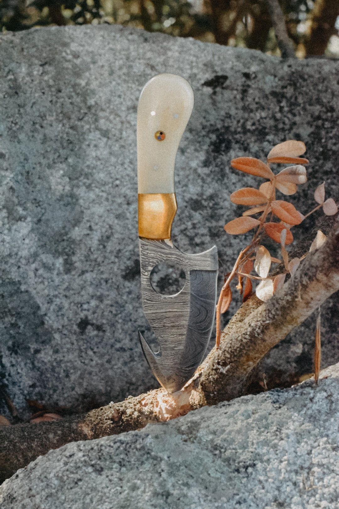 U Balagninu est une pièce artisanal qui associe l’excellence de la lame en acier Damas, reconnue pour sa robustesse et sa finesse de coupe, à un manche unique façonné en os de buffle et ornement.