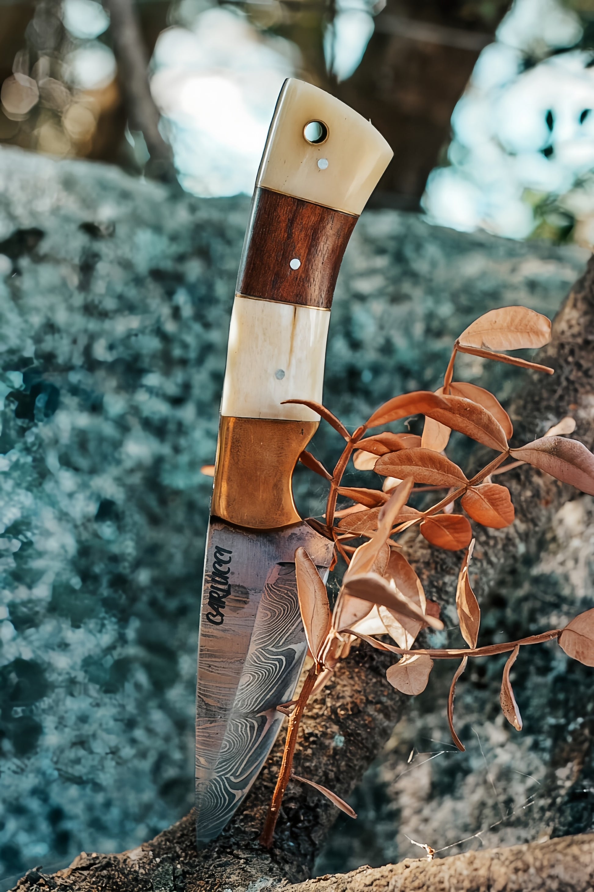Le Murato est une pièce artisanal qui associe l’excellence de la lame en acier Damas, reconnue pour sa robustesse et sa finesse de coupe, à un manche unique façonné en bois de châtaigner et arbousiers, os de buffle poli.