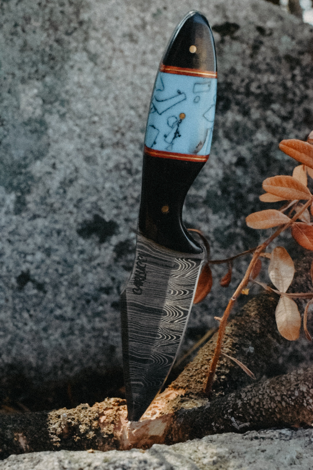 U Bastilicacciu est une pièce artisanal qui associe l’excellence de la lame en acier Damas, reconnue pour sa robustesse et sa finesse de coupe, à un manche unique façonné en corne de buffle et résine.